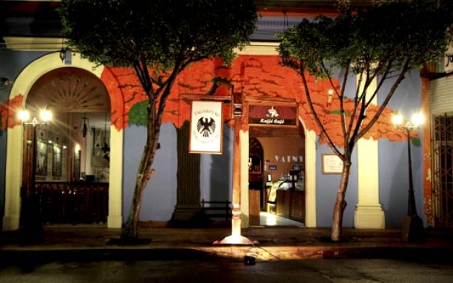Kaffé Café Bistro está ubicado en una casa colonial recientemente restaurada en pleno parque central de Masaya. Tiene diferentes ambientes temáticos pastelería, taberna alemana, pub inglés, cafetería con diversas propuestas gastronómicas y selección de menús internacionales: salchichas tipo bratwurst, gran variedad de chorizos de diferentes países. El ambiente gira alrededor de una magnífica terraza interior.